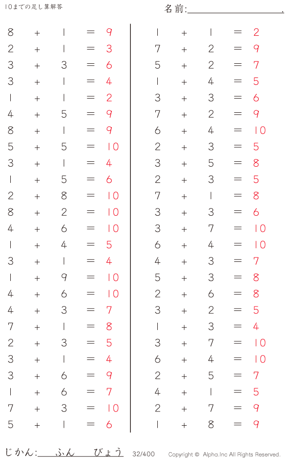 10までの足し算 解答 132 400