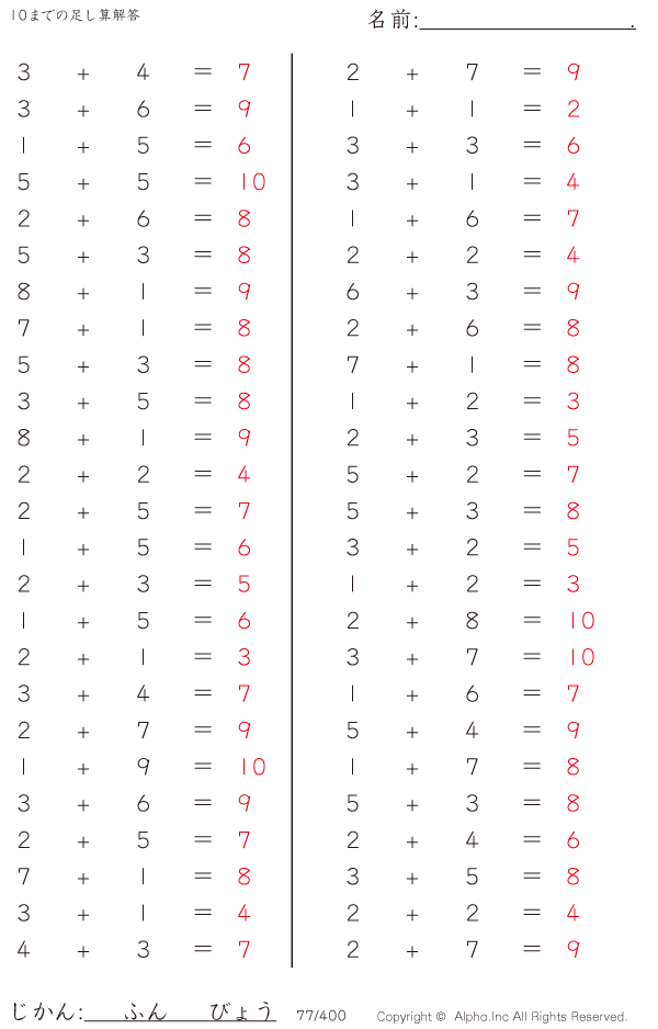 10までの足し算 解答 077 400